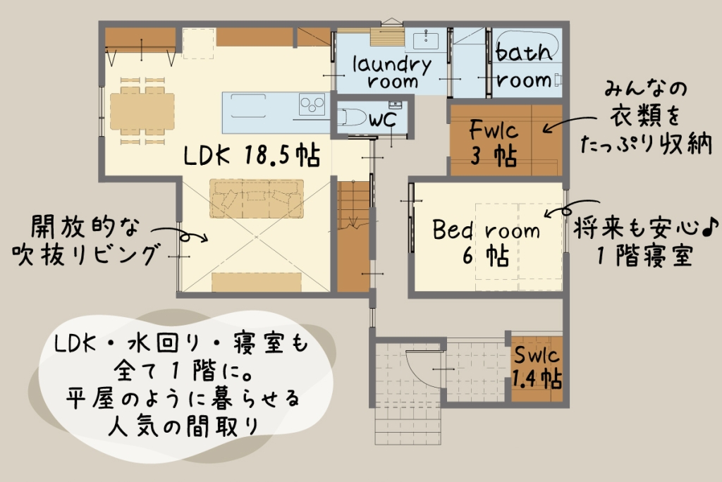 1階に寝室を設けた“平屋ライク”な間取りは、家族構成の変化や将来のライフステージにも柔軟に対応できます。