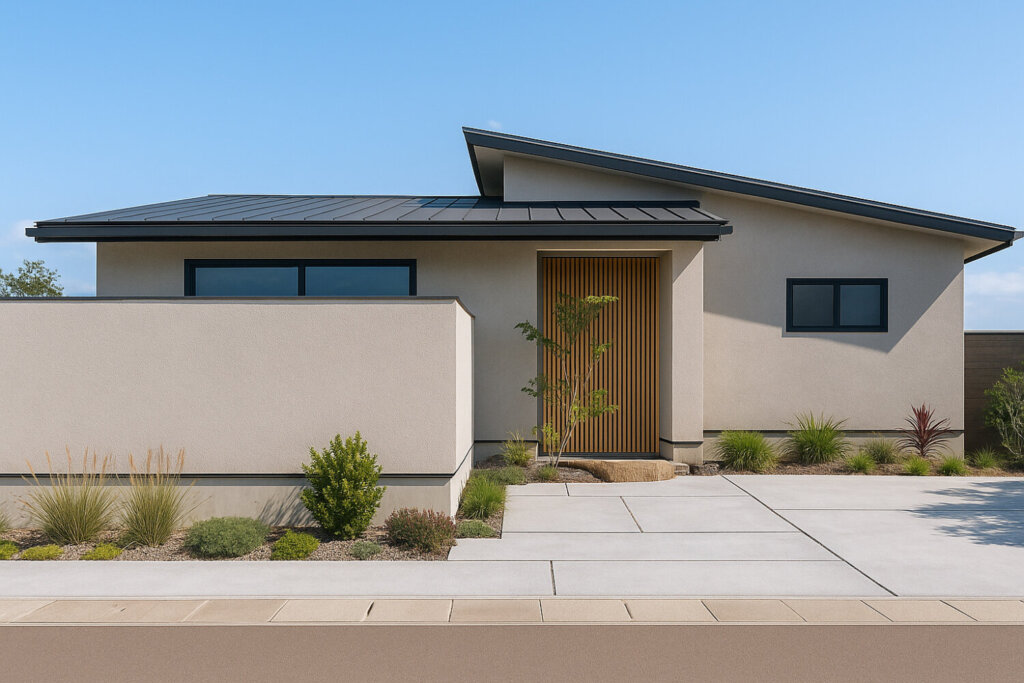 落ち着きのある色合いに、格子付きの玄関ポーチを組み合わせた和モダンデザイン。