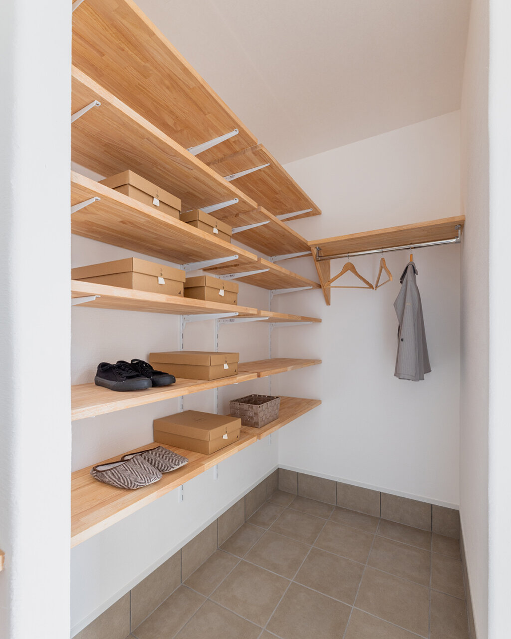 アウトドア用品や登山道具がスッキリ収まる土間収納。