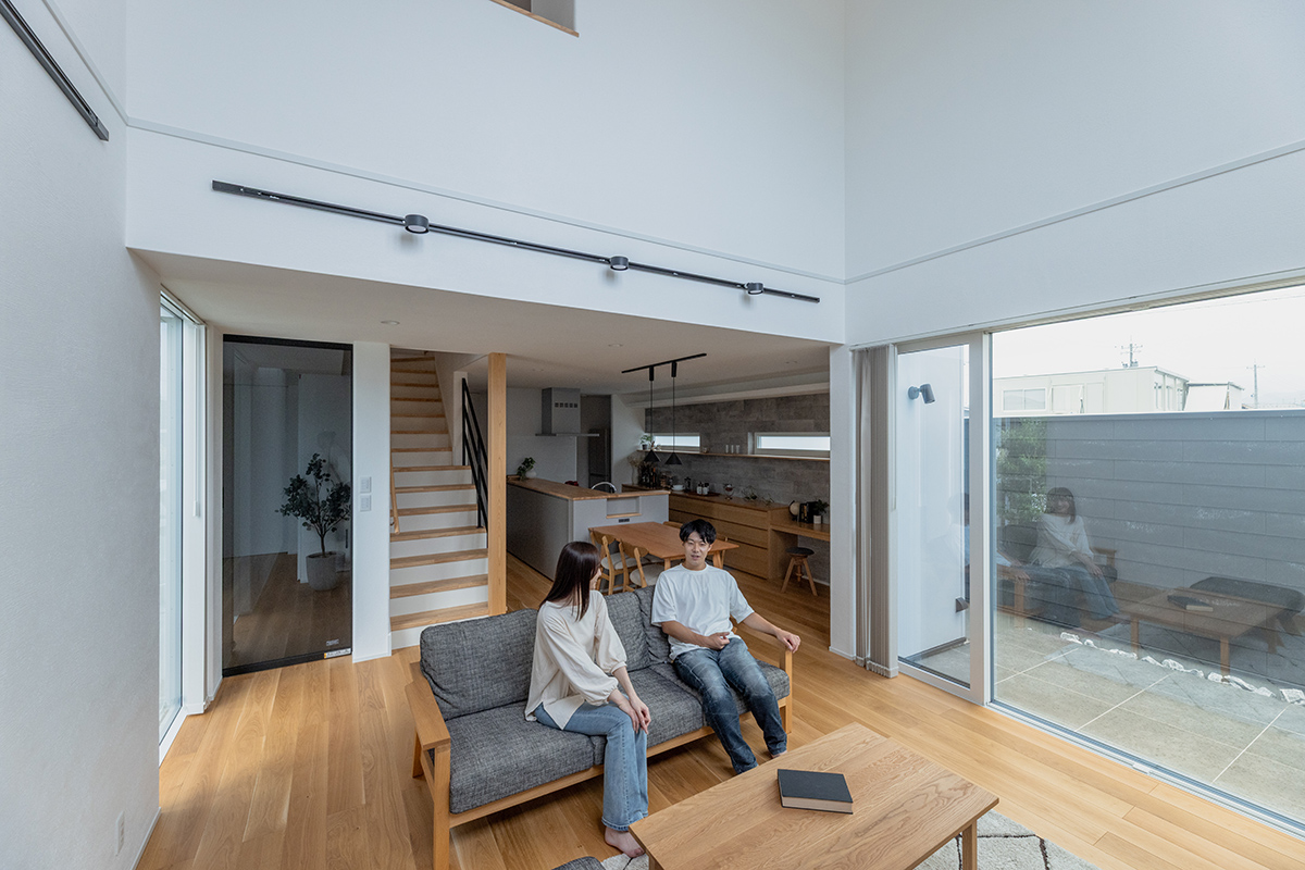 吹き抜けのあるリビングに大開口の窓を設け、室内とテラスがゆるやかにつながる開放感あふれる住まい。プライバシーに配慮した塀に囲まれたテラスは、外からの視線を気にせずくつろげるアウトドアリビングとしても活用できます。キッチンからリビングまでを一直線に配置した動線は、視線も生活もスムーズに繋がる設計。ナチュラルな木の風合いを活かしたインテリアが、柔らかな日差しと調和し、心地よい時間を演出します。