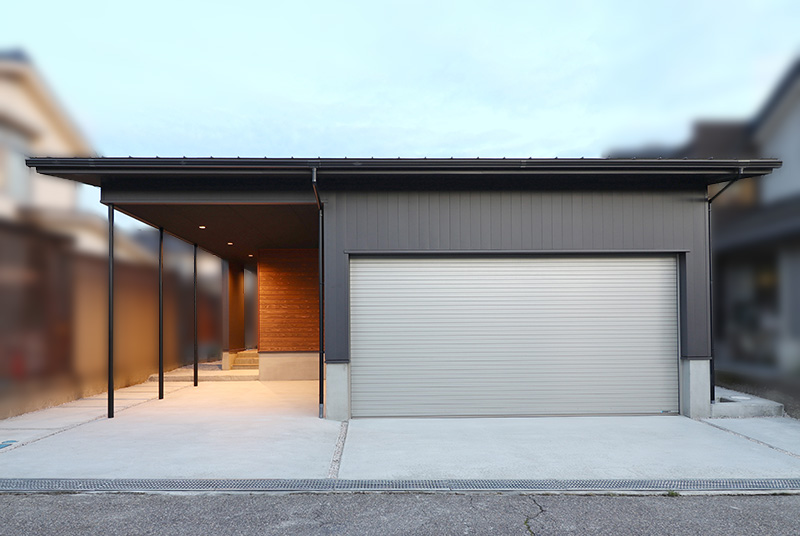 平屋の魅力であるモダンで横長のシルエットと黒のガルバリウム鋼板の壁が、重厚感と落ち着きのある雰囲気を醸し出します。