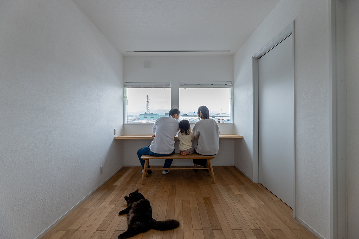 2階ホールには、広がる風景を楽しめる窓がデスクに面して設置され、季節ごと、時間ごとに移ろう自然の姿を存分に味わうことができます。