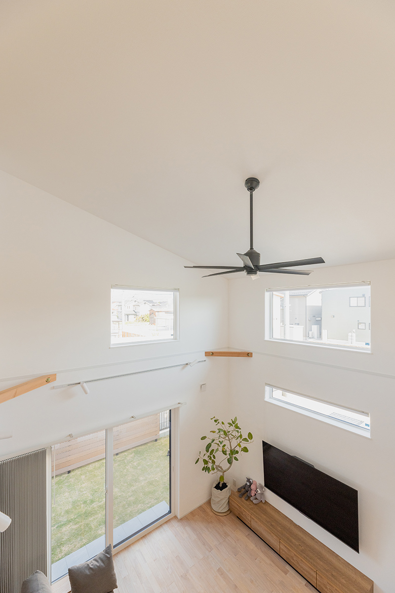 吹き抜けに合わせて大きく縁どられた窓からは沢山の自然光を取り込むことができ、リビングを優しい光で照らします。