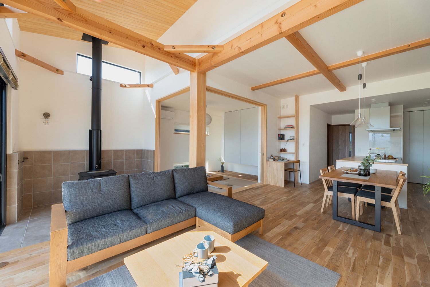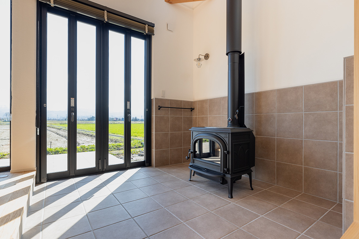 インナーテラスには薪ストーブを設置しました。夜は薪ストーブの前に座り、炎の揺らぎや薪が燃える音を聞きながらゆっくり過ごす時間は最高のリラックスタイムです。