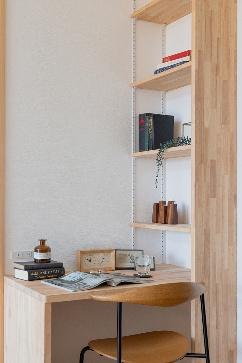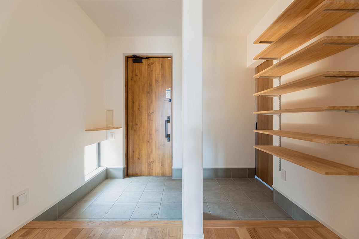 山下ホーム特有の自然素材を使用した造作棚を設けることで、室内に一体感をもたらします。