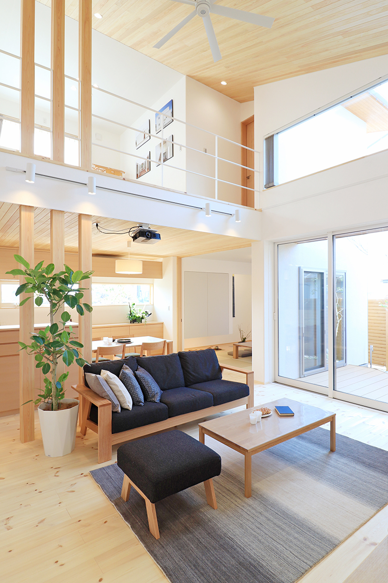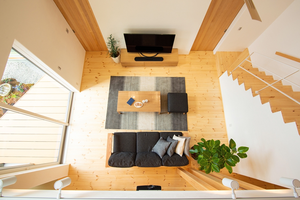 ウッドスペースや階段に直結したリビングはお家の中心です。