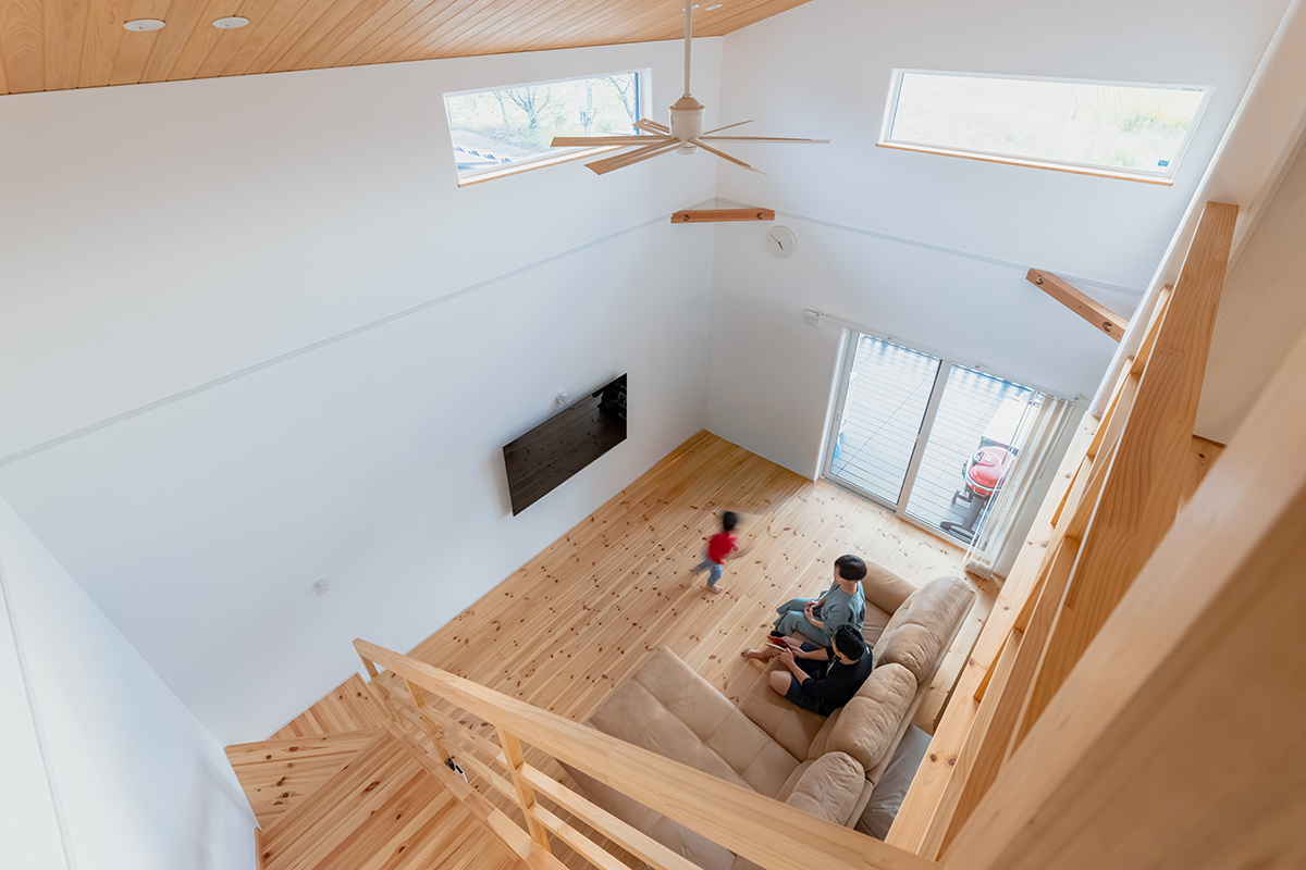 「勾配天井で大空間のリビングですが、1年を通して快適です。山下ホームの担当者さんが説明してくれていた通りの高い断熱性能で、冬でもあったか。依頼先に選んでよかったと実感しています。」