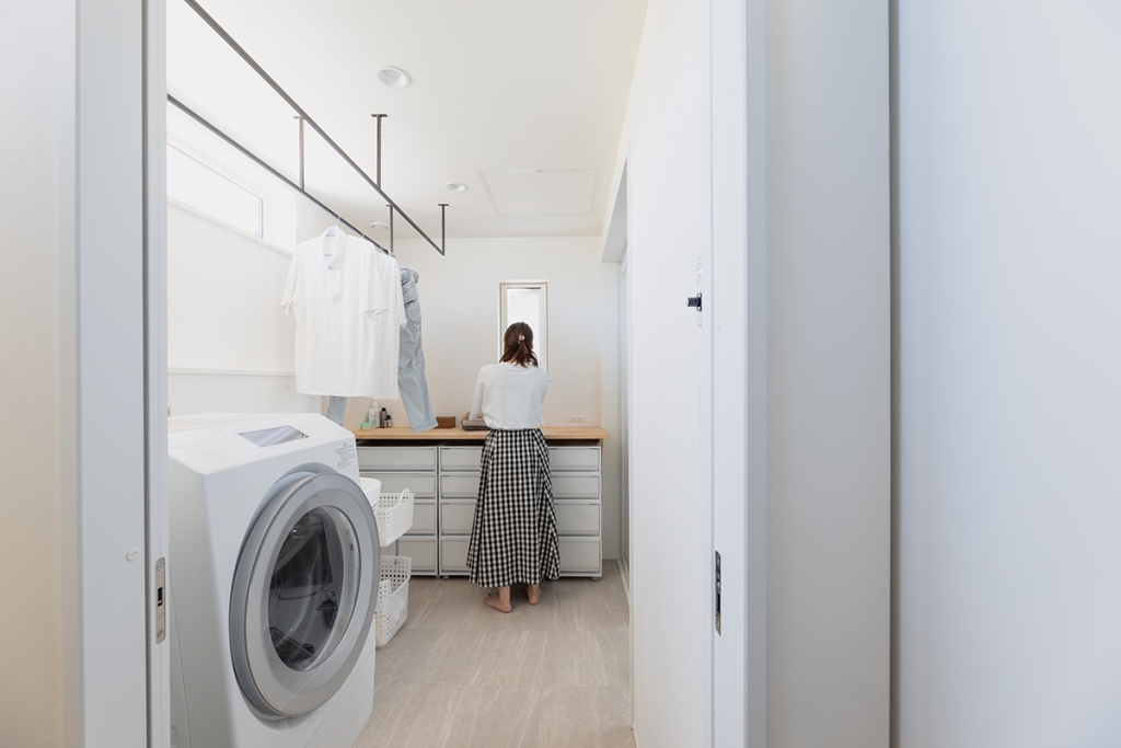 洗濯から乾燥、収納までを一室で完結させるユーティリティスペース。家事動線をシンプルに保つことで、毎日の作業がスムーズになります。洗濯機を使ってそのまま洗い、乾いた衣類をすぐに収納できるので、忙しい日々もストレスフリー。家事の効率を上げ、家の中がすっきりと保たれる便利な空間です。家事の時間を有効活用できること間違いなしです。