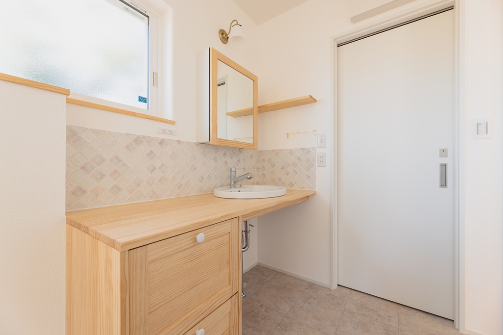 淡いトーンのタイルが空間を彩り、毎日の身支度が楽しくなるデザインです。