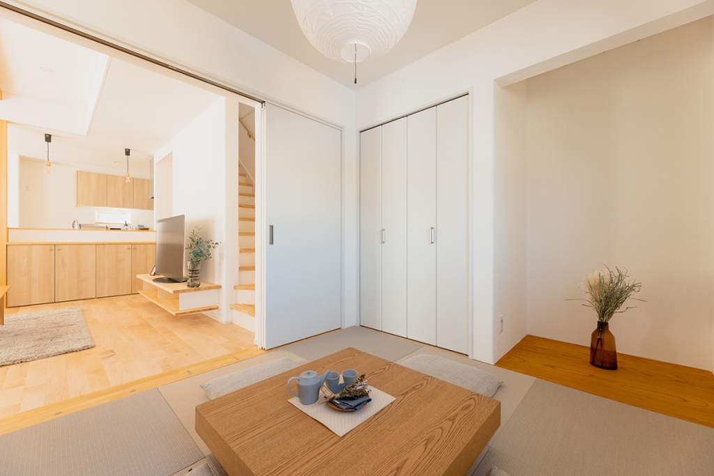 北欧スタイルで統一された室内に、やわらかなグレートーンでコーディネートした和室をプラス。