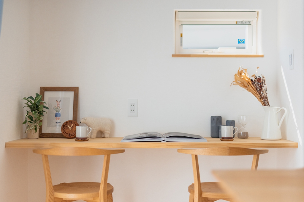 リビング空間の一角に、家族みんなが使える造作カウンターを設けました。お子さまの勉強スペースや、リモートワーク、読書タイムにも大活躍。家族の気配を感じながら、それぞれの時間を大切にできるのが魅力です。