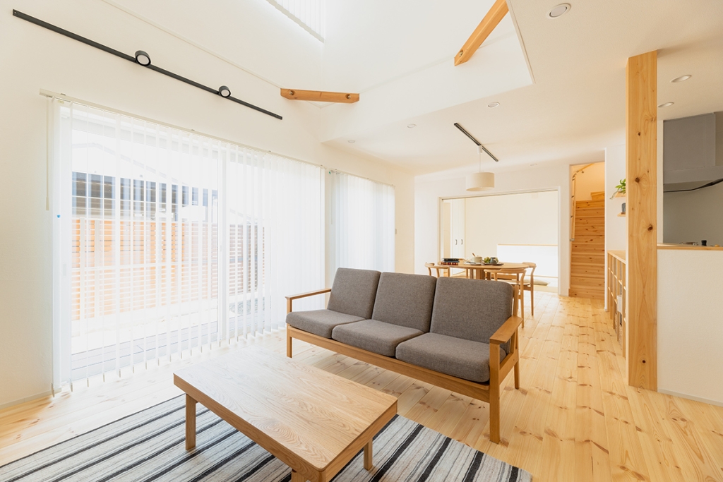 リビングには吹き抜けを設け、高窓からたっぷりの陽光が差し込む設計に。