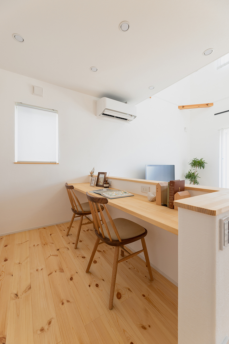 キッチン横には、家族みんなで使える便利なカウンターを設置しました。お子さまの宿題スペースとしてはもちろん、読書やちょっとしたパソコン作業、リモートワークにも活躍。キッチンからも目が届く場所なので、家事をしながらお子さまの勉強を見守れるのも嬉しいポイントです。使い方に合わせて自由に活用できる、家族に優しい設計となっています。