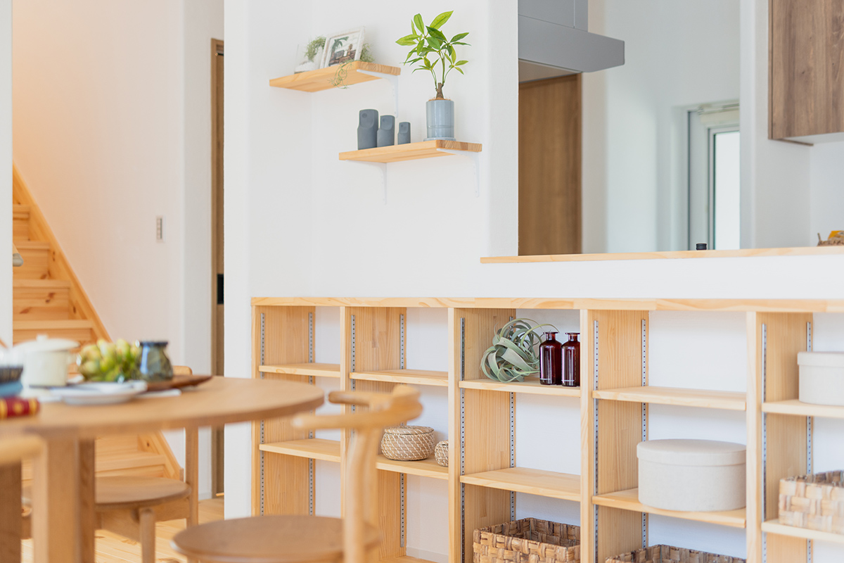 キッチン前のオープン棚は、リビング側に面しているので、雑誌や本、インテリア小物などをセンス良く飾れるスペースに。家族みんなが自然に手に取れる、便利でおしゃれな収納になりました。