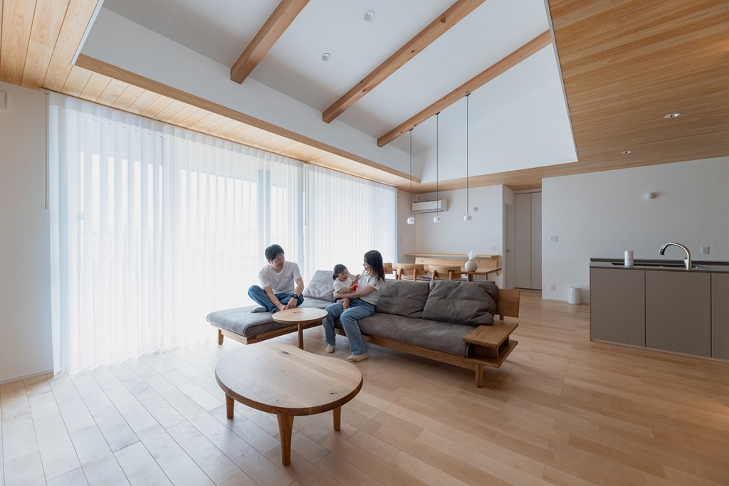 勾配天井の梁あらわしが印象的な、開放感あふれる平屋のLDK。天井や床には木をふんだんに使用し、やさしく心地よい空間に仕上がっています。大きな窓からは自然光がたっぷりと入り、日中は照明いらずの明るさ。リビング・ダイニング・キッチンがゆるやかにつながることで、家族が自然と集い、会話が生まれる暮らしを叶えました。