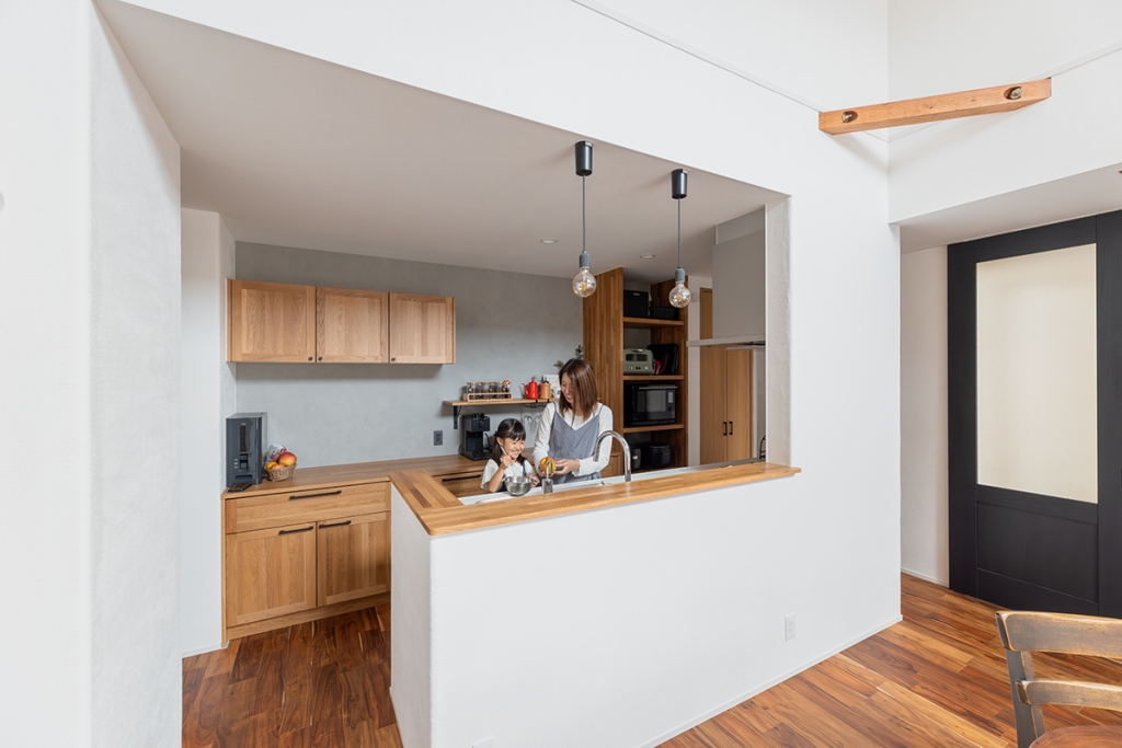 木の温もりに包まれた、ナチュラルな雰囲気の対面キッチン。無垢材の扉やカウンターが空間に柔らかさと落ち着きをもたらし、日々の調理時間も心豊かに過ごせます。背面には収納をしっかりと確保し、生活感を見せない美しいキッチンを実現。