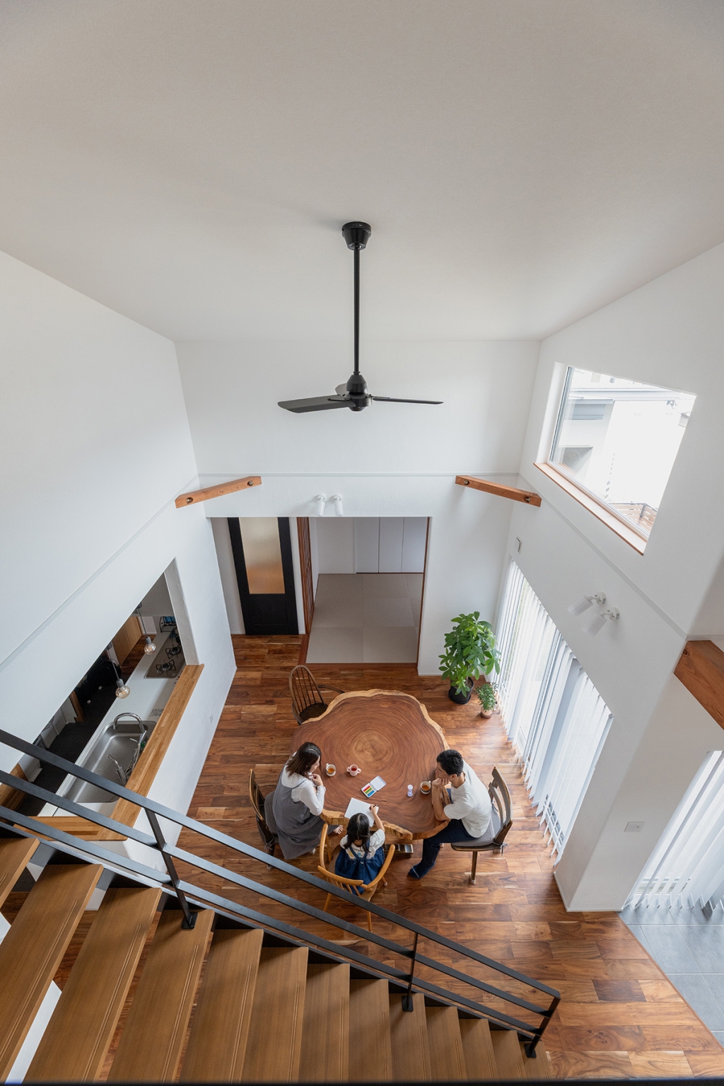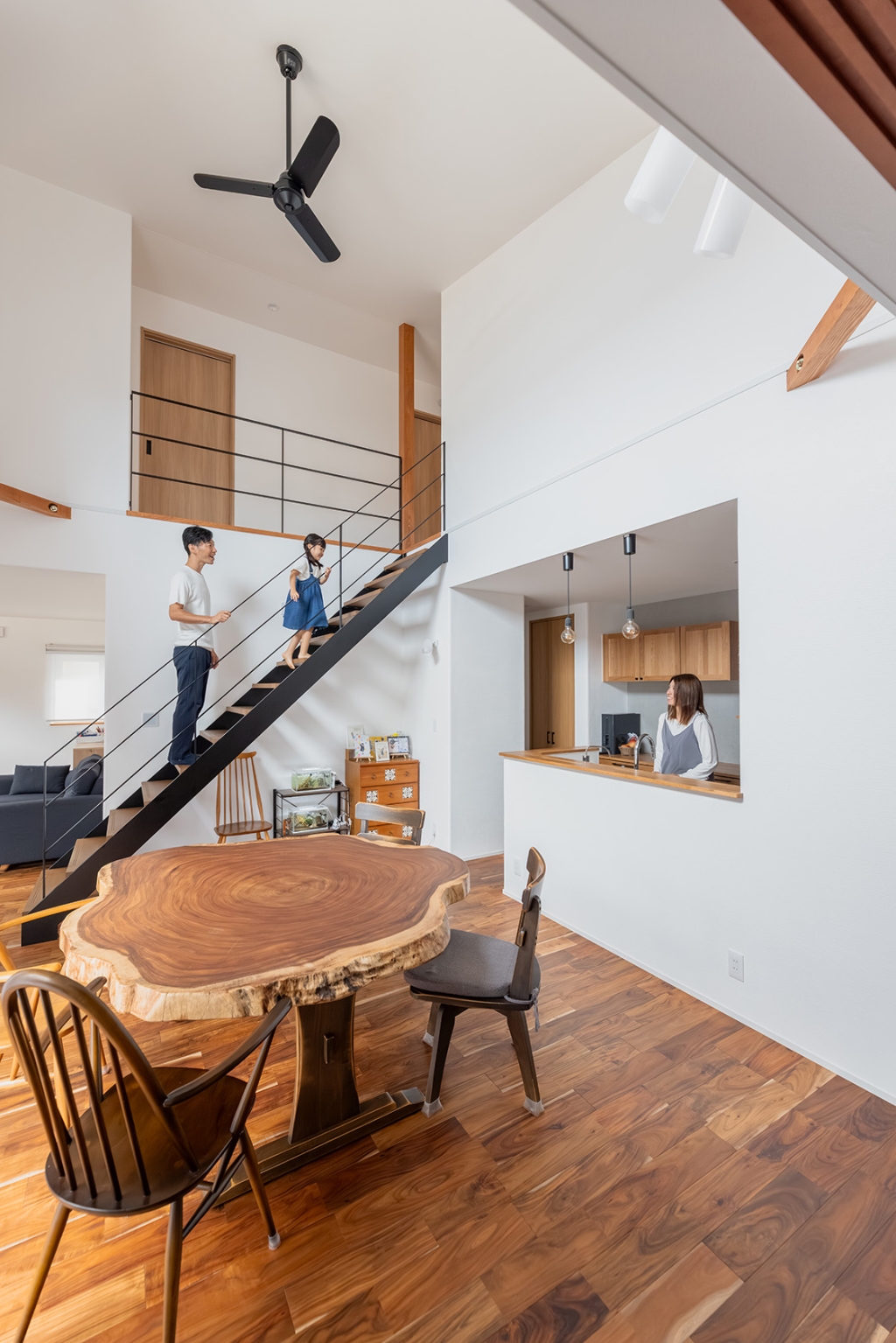 大きな吹き抜けが開放感を生む、心地よいリビング空間。天井までの高さが、自然光をたっぷりと取り込み、時間の流れとともに変わる光の表情を楽しめます。鉄骨階段と木の梁の組み合わせが、ナチュラルさの中に程よいアクセントをプラス。床には木目の美しい無垢材を使用し、家族が集うダイニングには存在感ある一枚板のテーブルを配置。自然素材と空間設計が調和した、家族のつながりを感じられるリビングです。