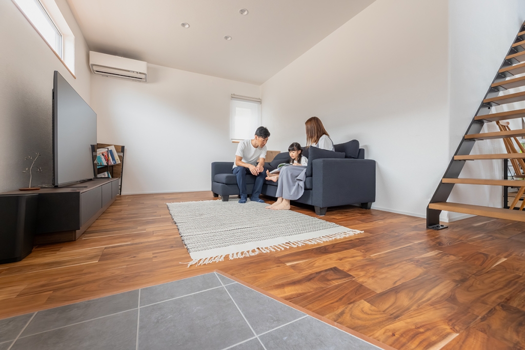 吹き抜けのダイニングとは対照的に、リビングは天井高をあえて抑え、落ち着いた時間を過ごせる空間に設計。こもり感のある心地よさが、ご家族のくつろぎタイムをやさしく包み込みます。