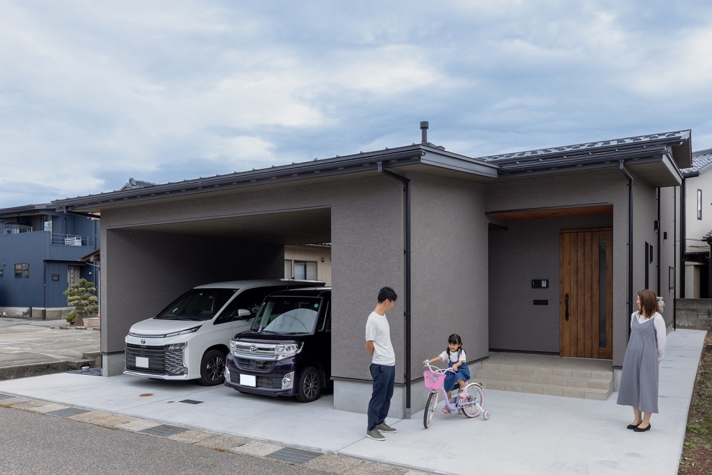 シンプルながらも存在感を放つ、深みのあるグレーの外壁が印象的な一邸。吹付塗装ならではの質感が、落ち着きと高級感を演出します。軒のラインを水平に整えた低重心のフォルムが、美しい佇まいを際立たせ、街並みにも自然に溶け込むデザインです。