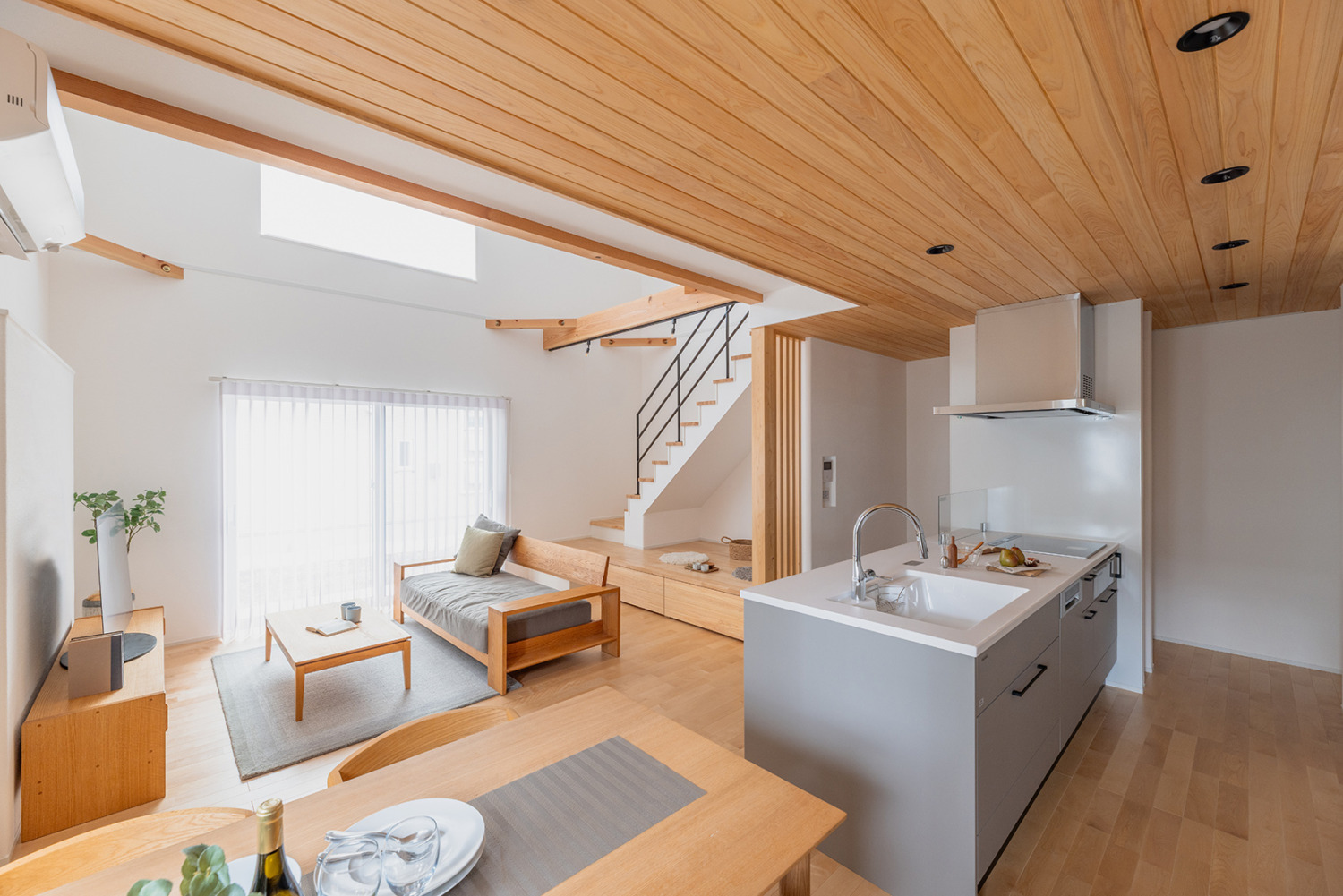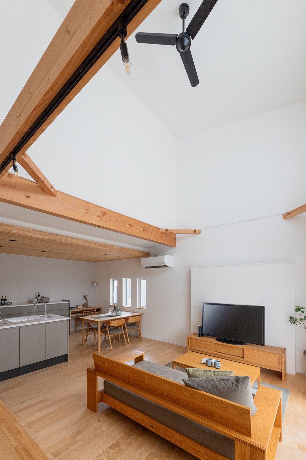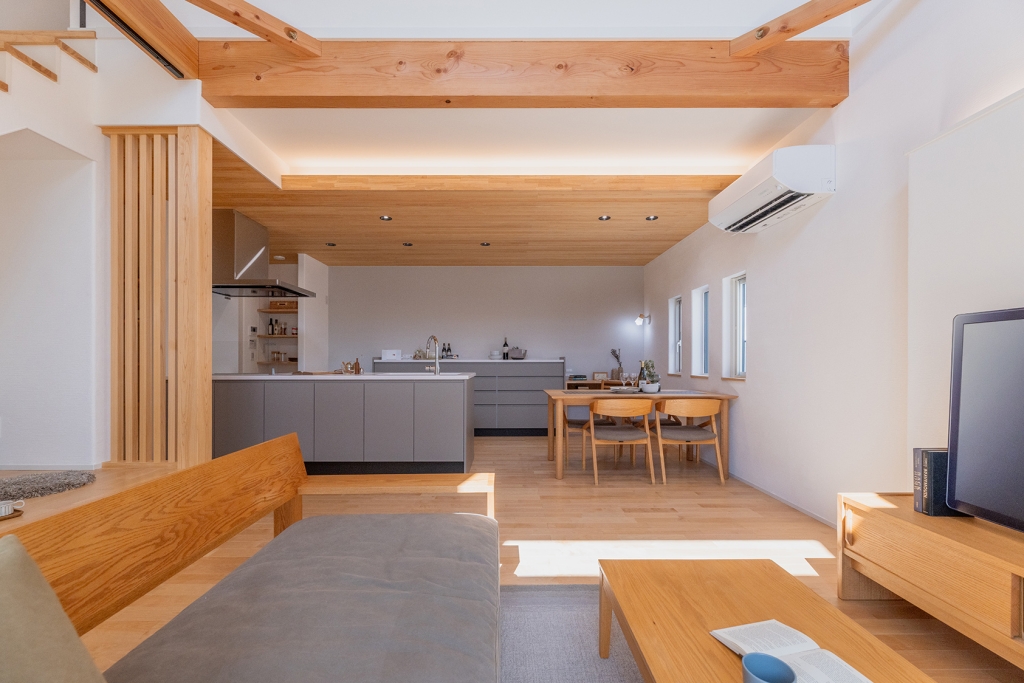 勾配天井と高窓から光が差し込むLDKは、家全体に開放感をもたらします。梁あらわし天井やナチュラルな木目の床・天井が空間にあたたかみをプラス。