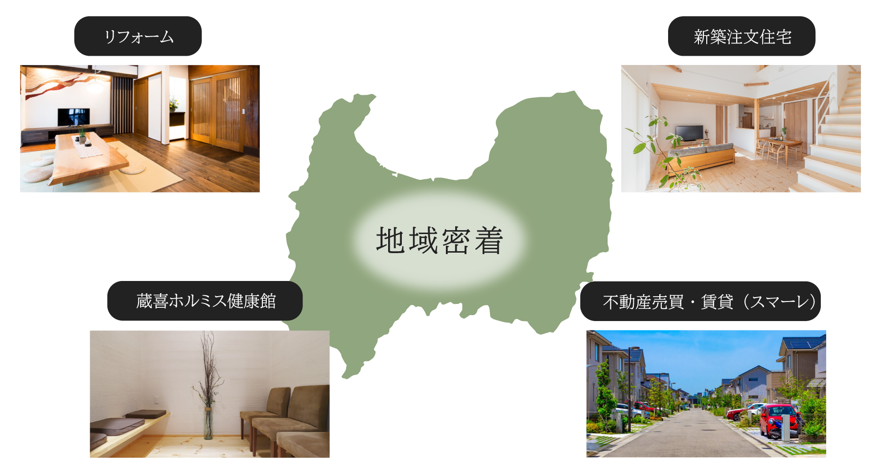 | 事業内容 | 一般住宅、店舗、無添加素材リフォーム、ガーデニング、不動産、家具キッチン、家具・雑貨販売 |